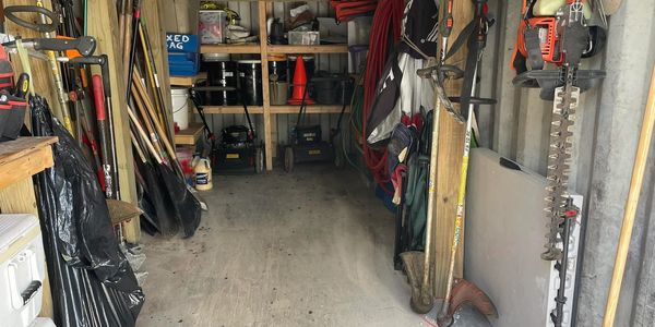 Equipment such as, shovels, rakes, wheel barrows, trimmers, weed whackers, chainsaws.